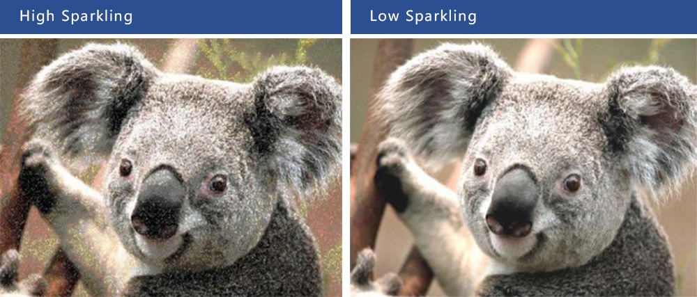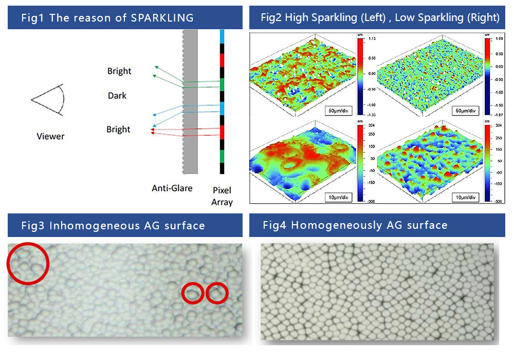 The reason of SPARKLING is when the LCD light through AG surface , if the AG treatment is Inhomogeneous(Fig3) , the light of R / G/ B from LCD Pixel will be interference each other and cause SPARKLING . We can control the particle or caves of surface to ensure homogeneously surface to reduce SPAKLING effect .