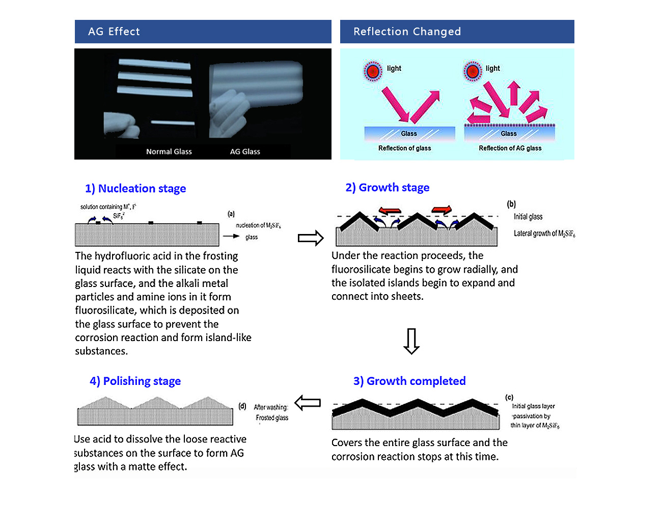 - Features:By chemical etching or spraying process, the reflective surface is the original glass is changed to a diffused surface, which changes the roughness of the surface of the glass, thereby producing a matte effect on the surface.