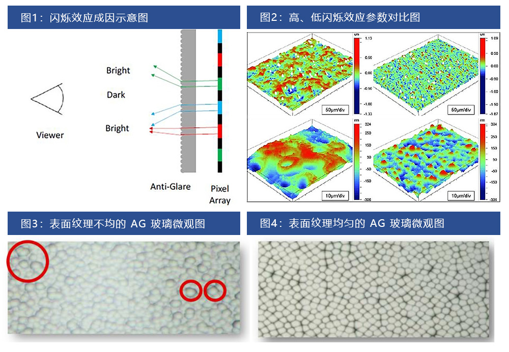 AG 玻璃产生闪烁效应的核心原因是:LCD 液晶显示屏的光线透过 AG 玻璃表面时,若AG 玻璃的表面处理纹理不均匀(图3),显示屏像素发出的红、绿、蓝三色光会相互干扰,最终引发闪烁效应。通过精准控制玻璃表面的颗粒或凹坑形态、保证表面纹理的均匀性,可有效降低闪烁效应。